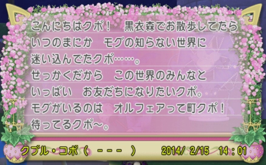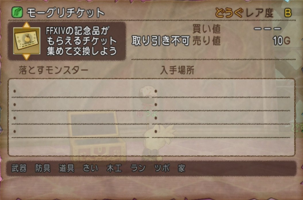 彼方此方で撮影したり サボテンダーコイン行ったりして見ました。 今回は弱1周、強4周でチケット9枚入手です。 Watch 強サボテンダーコインサボテンぽい感じで in テクノロジー・ゲーム | View More Free Videos Online at Veoh.com おかげさまで「つよ」は記念品コンプいたしました。 次はサブの「びすこ」ちゃんだな。 「キリンビバレッジ×『ドラゴンクエストX』×ローソンキャンペーンが始まってますね。 過去数回ありましたよね、メタスラ系のアイテムもらえた奴ねw で本日近所のローソンで買ってきました、 対象商品の「ファイア 挽きたて微糖」120円*15本ww 早速キャンペーンのページでレシートのコード入力して15ポイントゲットw でもって次の商品すべていただて来ました。 ふくびきけん×3枚 経験値の古文書・大×1個 ふくびきけん×5枚 超元気玉×2個 青と白の傘 結局青と白の傘がほしいんですけどねw ものが傘ですので今回はオガコの「びすこ」に持たせることにしました。 こんな感じになりますよ~w 相方さん呼んでプチ撮影会w 「ファイナルファンタジーXIV」と「ドラゴンクエストX」とのコラボレーションイベント が始まりましたのでやってきました。 期間限定クエスト「お花大好きクポ!」って奴です。 早速流れから まずお手紙ね。 ↓ って事なのでオルフェアの町に行くと~ 初日の夜にこの↑写真撮るのはちょっとムリでした;(後日撮影です) 実際はこんな感じでしたw モーグリの「クプル・コポ」が居るので話しかけて受注。 なんかの花もってこいって言われるので、 バザーで買うか恵んでもらうかして調達w (花は畑で育てるお花ね) 毎回ランダムで変わるみたいなので、大量買いしないでねw ↓ 「クプル・コポ」にお花渡してクエスト終了 初回報酬として名声111とサボテンダーコインもらえます。 前回のシャントットと同じシステムで強コインとの交換可能です。 迷宮いってボス倒すと「モーグリチケット」もらえて枚数集めて記念品と交換w 毎度のことですが、今回も初挑戦動画作ってます、も~ちょっと待ってね。 今回の記念品交換ベスリン↑は預かり所前にいますよ~。 でもって次が貰える景品と必要なチケット枚数ね。 しぐさ書「サボテンダ」 1枚 モーグリの像・庭 2枚 サボテンダーの像・庭 2枚 サボテンダーマスク 5枚 モーグリのぼうし 8枚 しぐさ書「サボテンダ」やってみました、マジで笑えますw | プロフィール