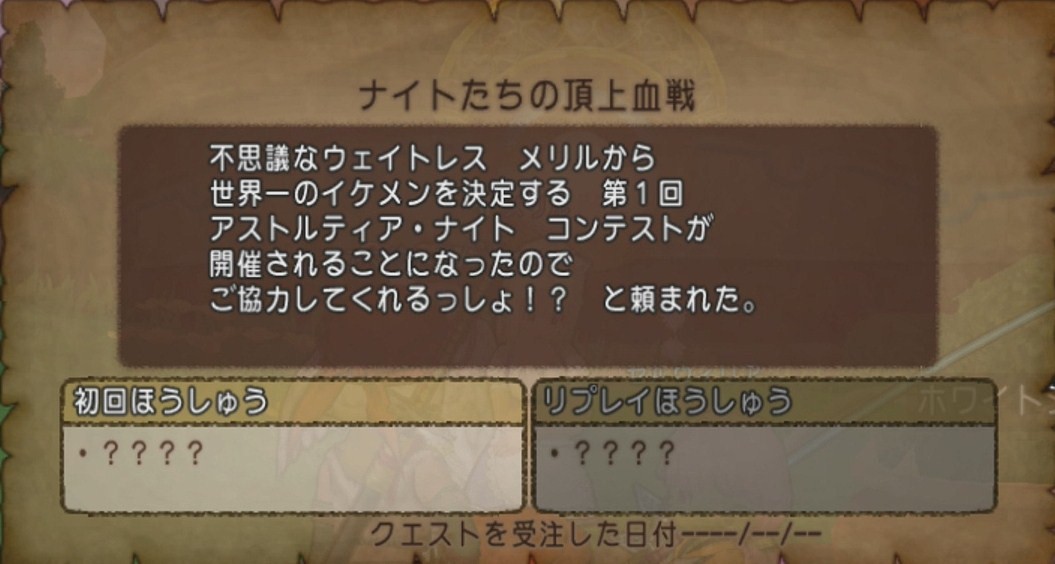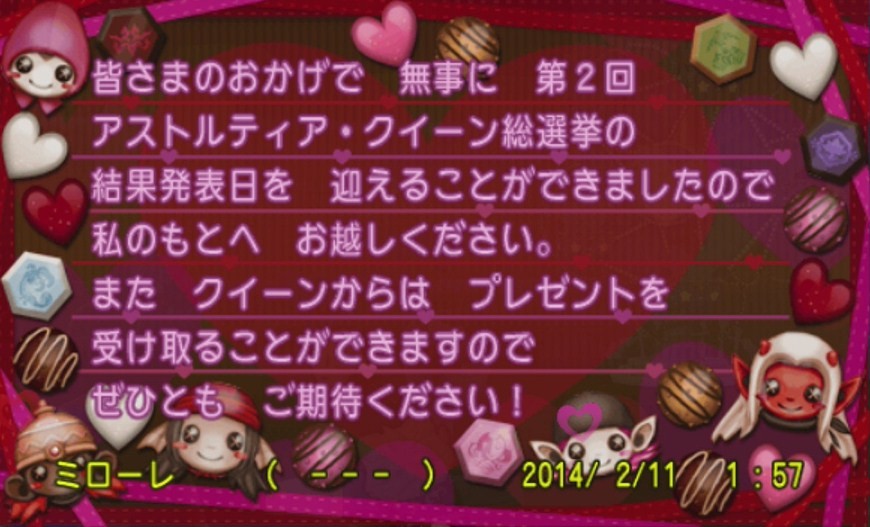 【結果発表】 2014年3月11日(火) 0:00 ~ 3月14日(金)23:59 バレンタイン同様イベント会場行って~~な感じの流れになります。 その流れですが アズラン、グレン、オルフェアといった住宅エリアがある町で ウエイトレス姿の「メリル」さんにに話しかけて、 ↓ イベント会場 も一度「メリル」さんに話しかけて クエ受注 期間限定クエスト「ナイトたちの頂上決戦」です。 ↓ 中入ってムービーみて 好きな「野郎」に話しかけて~ 何とかってクッキー持ってくるようにいわれるので 今回は「ザンクローネ」様推しでいきますww