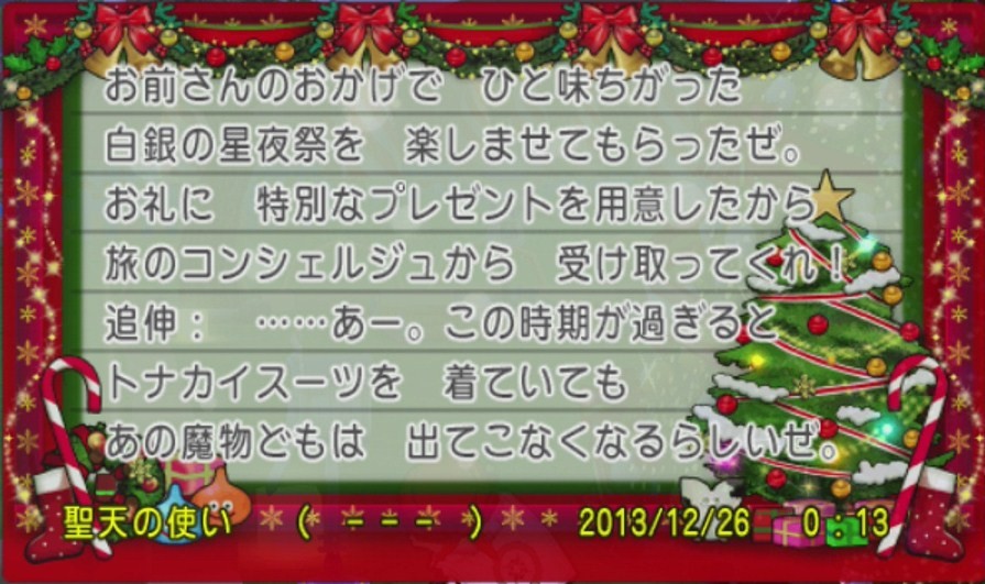 第4回 集えオガ娘。〜レンダーシアで会いましょう〜 です。 今回はグランドタイタス号、21鯖での開始でした。 制服オガコいっぱい~~www ↑前回のこのイベントでフレ成ってもらった「チュンリィ」さん。 クリスマスも記念撮影してもらったよねw 今回も多数のオガコちゃんとフレなって頂きました。 マジうれしすっすw 会場で主催者様とお会いしました、緊張しましたが「いいね」して話しかけてみましたw 残念ながらフレ枠埋まってるらしくフレ依頼は断られてしまいました; でも相互リンク貼ってもらえるかもです。 「謹賀新年! アストルティア 大ふくびき大会!」始まりましたね。 早速やってきました。 実はいそいでやるつもりもなかったんですが、 とにかく頼んでもないのにいっぱいでるのよ、「新春依頼書」って奴、 滅茶苦茶荷物を圧迫するので、これは先にやちゃわないとって感じw やり方は普通の依頼書と同じ、 受けて~、倒して~、クリアして~、報告~。 報告すると「新春ふくびき券」もらえるので外に居る 「新春ふくびきマン」のところで福引。 (初日は人多いよね~~w初詣の明治神宮みたいw) 内容は 特等 高貴な紋付はかま(女性キャラは「華やかなふりそで」ねw) 1等 風雅なぞうり 2等 お好きな新春家具ひとつ 「新春家具」はこちらの5種 ・お正月の門松(庭具) ・お正月のこたつ ・お正月の鏡餅 ・おもちのせ七輪 ・獅子舞チェスト 2回目で特等とかあっさり出ちゃいました、逆に「風雅なぞうり」が 中々でなくってねw でも結構直ぐコンプリートでしたw ってことでクリスマスイベント終了しました。 特別なプレゼントですが、まさかコインボスのアクセが届くとはw って事でバトチョー初ゲットです。 なんか納得行かない気がするわ;(アトラス12匹倒してるのに;) それとクリスマスモンスター動画1個にまとめましたので公開します。 しつこかったかな?w Watch クリスマス限定モンスター2013前後編版 in テクノロジー・ゲーム | View More Free Videos Online at Veoh.com | プロフィール
